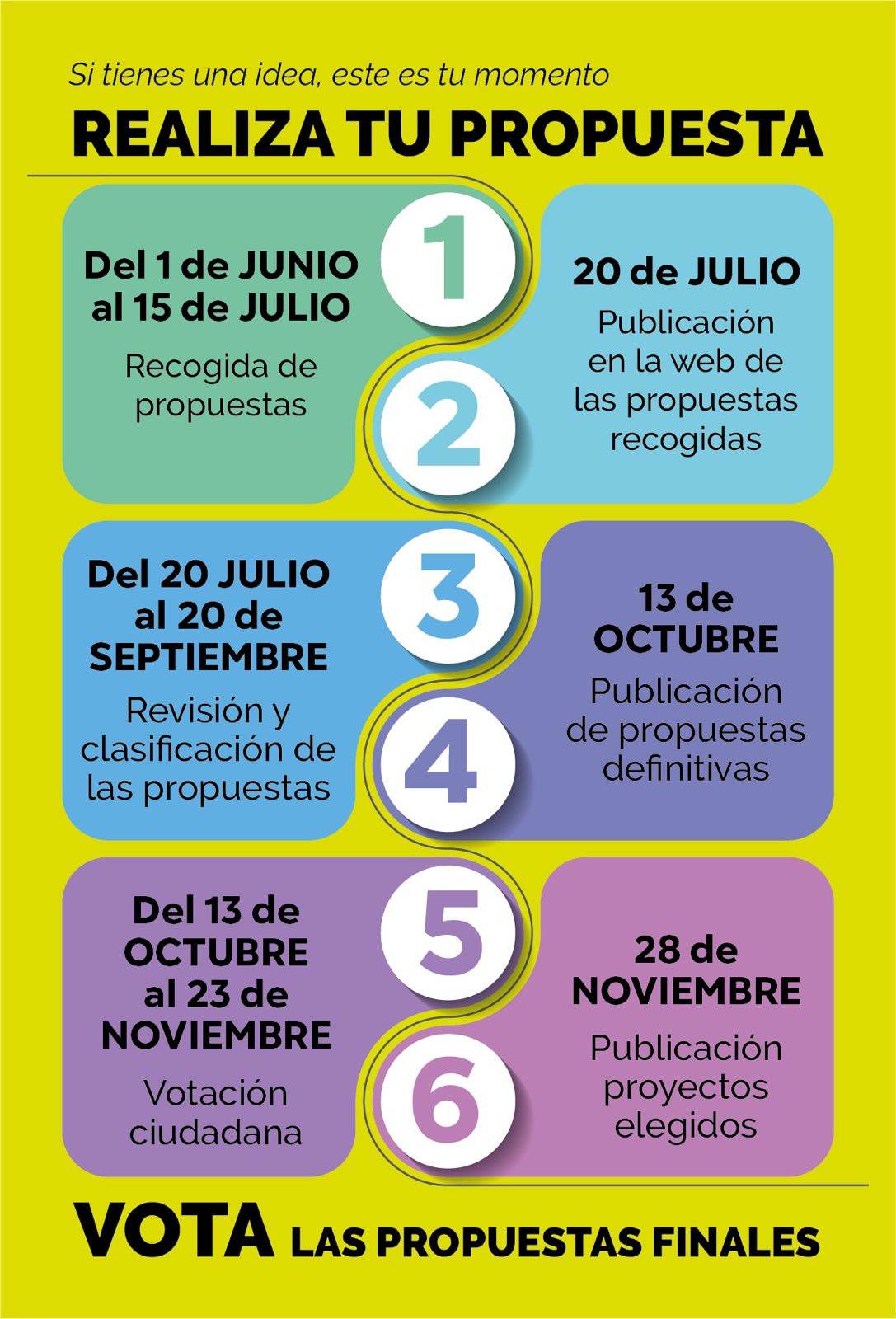 El proceso de presupuestos participativos se inicia con la elaboración y presentación de sencillas propuestas por parte de la ciudadanía, que posteriormente serán clasificadas y votadas.